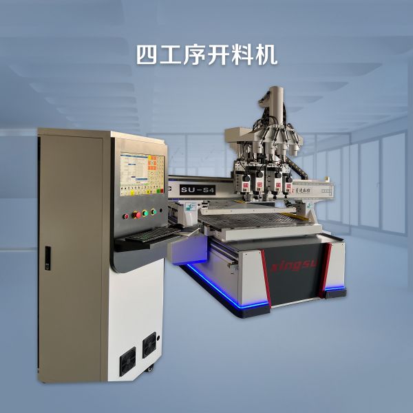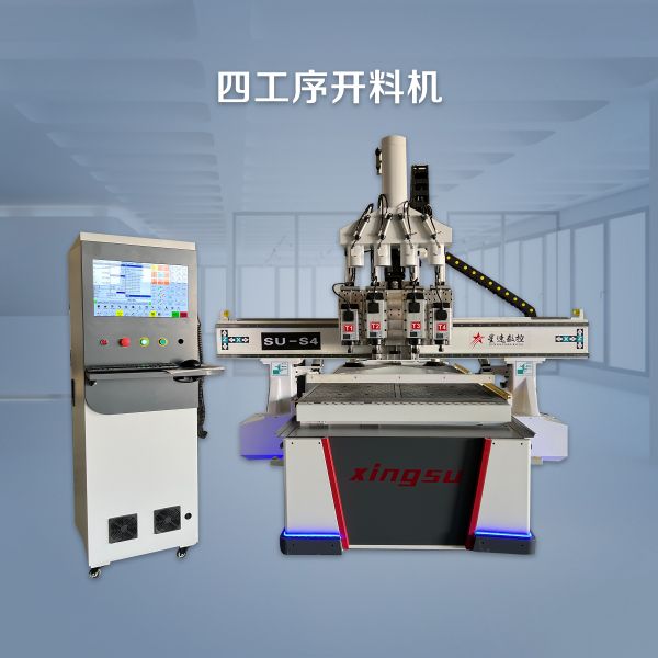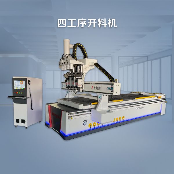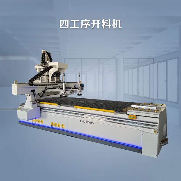 四工序數(shù)控開(kāi)料機(jī)機(jī)器機(jī)頭部搭載四個(gè)主軸,在加工櫥柜時(shí)主軸上裝載的刀具分別為6mm,8mm,10mm,15mm。在打孔時(shí)四個(gè)主軸氣動(dòng)切換來(lái)解決所需孔位,在開(kāi)槽和開(kāi)料兩個(gè)裝載6mm刀和8mm刀的主軸進(jìn)行加工. 同時(shí)四工序開(kāi)料機(jī)也可以實(shí)現(xiàn)簡(jiǎn)單吸塑門(mén)板造型的加工。所以,四工序開(kāi)料機(jī)建議剛開(kāi)始干家具廠的客戶選擇,投資預(yù)算比較低,搭配側(cè)孔機(jī)產(chǎn)量也可以滿足前期的加工量的需求。